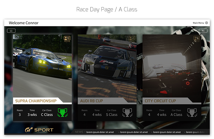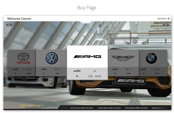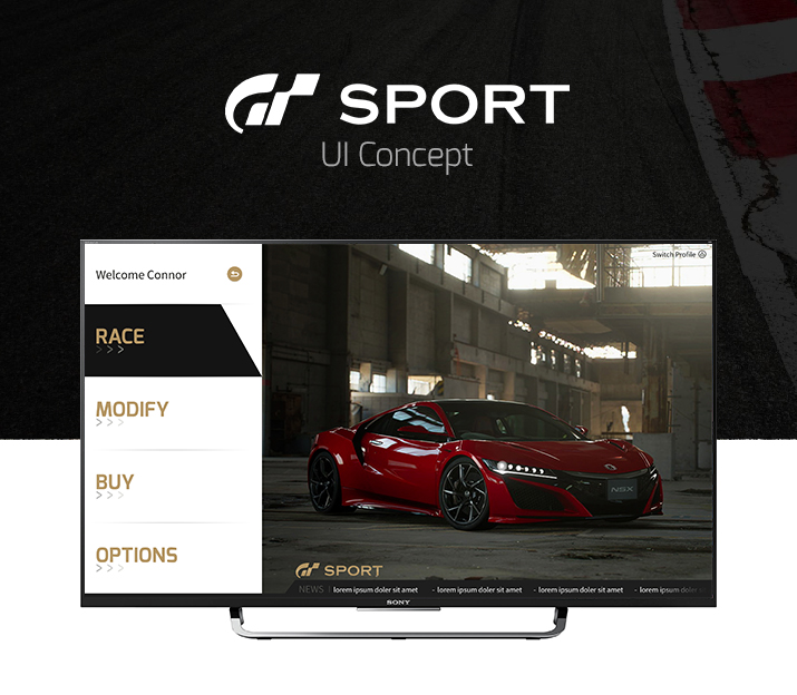 Gran Turismo Sport UI Personal Work Brief Inspired by the upcoming launch of Gran Turismo Sport, I decided I would design my own UI for the game and how I image it could look before its release later this year. Software Used